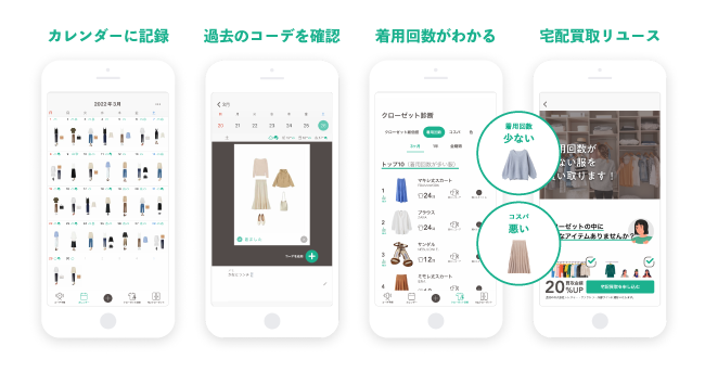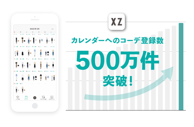 「XZ(クローゼット)」は、手持ちのファッションアイテムをアプリに登録することで、クローゼットの中身をデジタル化できるオンライン・クローゼットアプリです。AIスタイリストによる手持ち服を使ったコーディネート提案機能や、着用予定・着用したコーディネートを管理できるカレンダー機能を搭載し、毎日のコーディネートを考える際にご活用いただいております。カレンダーに登録されたコーディネート数は年間約190万件を超え、2022年3月には累計500万件を突破しました。