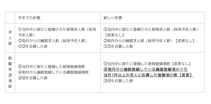 そうした背景を受け、「DODA転職求人倍率レポート」では、前月までの(繰越)転職希望者の対象を「DODA(エージェントサービス)にご登録いただいている方」から、より転職活動に積極的な「当月に求人応募された方」に定義変更し、転職マーケットの需給のバランスをより正確に反映できるようにしました。