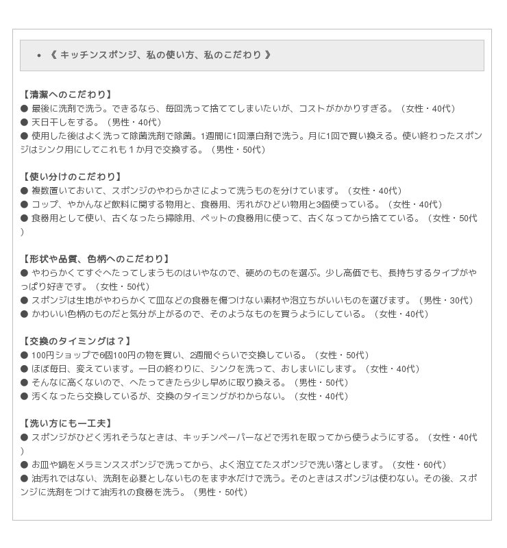 最後に、キッチンスポンジの使い方やこだわりを自由回答で教えてもらいました。安価なものを使い捨てる人と、多少高価でも長持ちするものを好む人と、両極に分かれるようです。衛生面へのこだわりでは、複数個を使い分けたり、食器用からシンク用へなどと順次格下げしたりする、という回答も目立ちました。「ほぼ毎日」替えているという潔癖な人がいる一方で、「交換のタイミングがわからない」と迷う声も。自分のやり方でいいのか、ほかの人がどうしているのか気になるようです。あなたはキッチンスポンジにどんなこだわりがありますか?