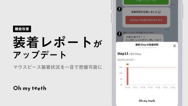口腔内Webカメラアプリだけでなく、毎日のマウスピース装着レポートをグラフで分かりやすく表示しユーザーが今どのくらい装着できているのかをより直感的に把握できるようになりました。