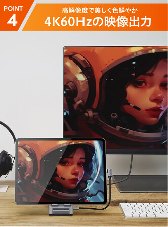 HDMIポートを通じて4K@60Hzの高解像度映像を出力し、映画や動画を大画面で鮮やかな色彩と滑らかな再生で楽しむことができます。また、プレゼンテーションやリモート会議でも高画質を維持し、プロフェッショナルな印象を与えます。