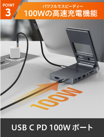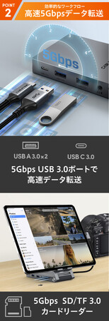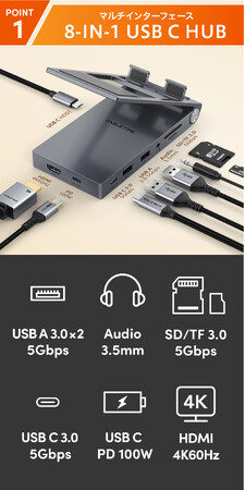 HDMI出力 4K60Hz、PD 100W充電ポート、USB-C 3.0 5Gbps、USB-A 3.0 5Gbps、3.5mmオーディオポート、SD/TF3.0 5Gbpsなど、8つの多機能インターフェースを1つに統合。