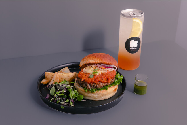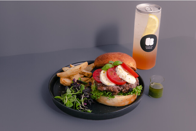 バブルスバーガー名物のジューシーパテに、「越のルビー」とモッツァレラチーズをカプレーゼ風にのせ、オリーブオイルと塩コショウでシンプルな味付けにすることで、素材の良さが味わえる一品に。別添えの自家製バジルソースで味変も楽しめます。