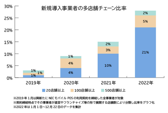 NECモバイルPOSのシェアが増えている理由に、大手飲食チェーンの比率が増えていることが考えられます。下記のグラフは20店舗以上、50店舗以上、100店舗以上の3軸に分けた多店舗チェーンの比率で、大手飲食チェーンの割合が3年間で約9倍になっていることがグラフからも読み取れます。