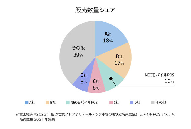 富士経済の『次世代ストア&リテールテック市場の現状と将来展望 2022年版』の調査データによると「NECモバイルPOS」はサブスクリプション型のタブレットPOSでは全体の10%を占め、シェアで3位(※)となっています。