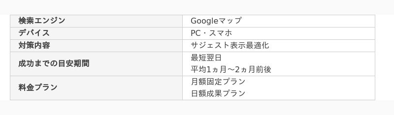 Suggesul(サジェスル)の Googleマップサジェスト対策 の仕様は以下の通りです。