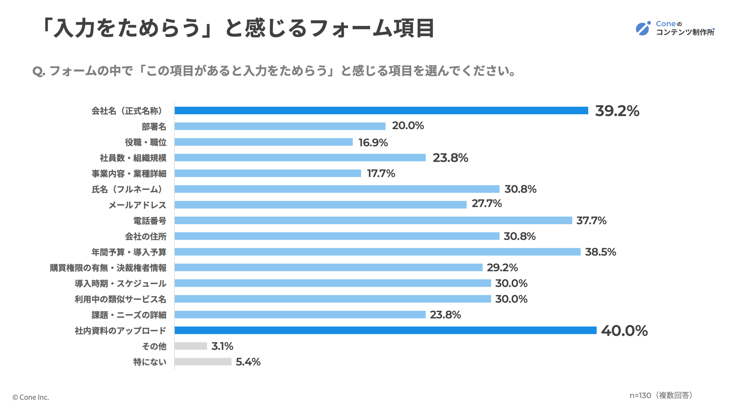 一方で、フォーム運用者側は、「会社名(58.2%)」「メールアドレス(49.4%)」「氏名(39.2%)」をリード品質担保のための“削れない必須項目”として上位に位置づけています。