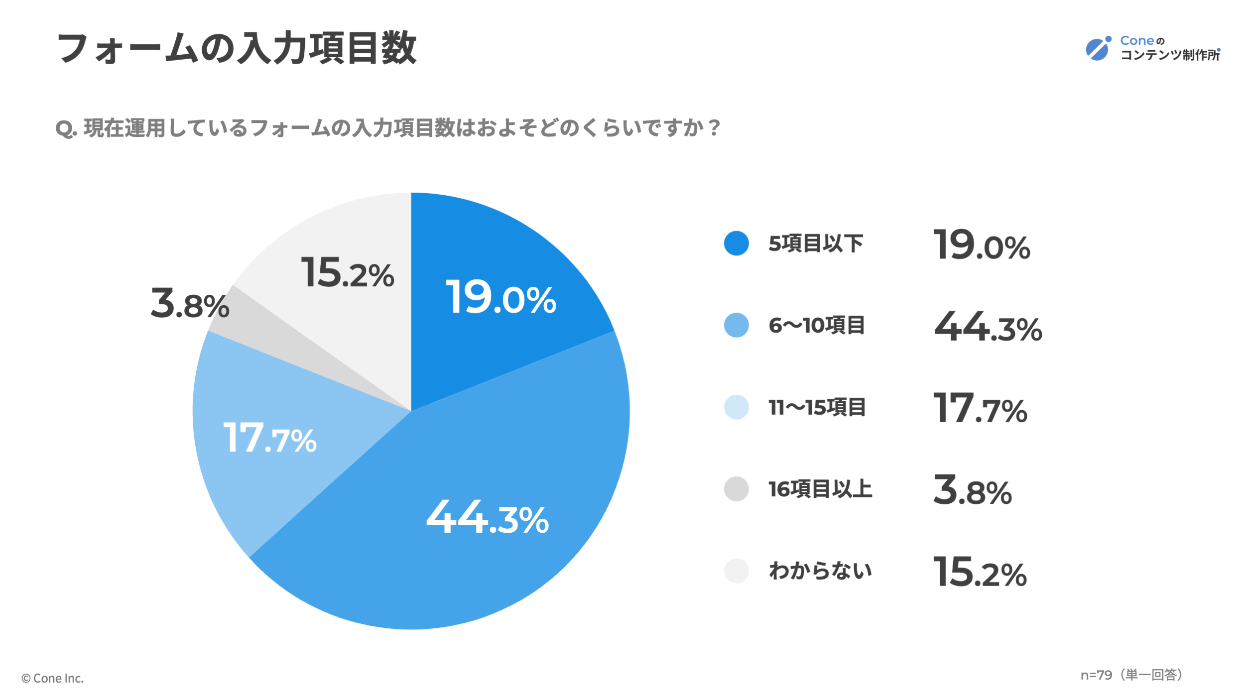 フォーム運用者は、離脱リスクを懸念して「6〜10項目」(44.3%)を現実的な妥協点としています。[画像6: https://prcdn.freetls.fastly.net/release_image/89413/49/89413-49-54baed0296319f55a9d70ff282a915e0-2500x1406.png?width=536&quality=85%2C75&format=jpeg&auto=webp&fit=bounds&bg-color=fff ]