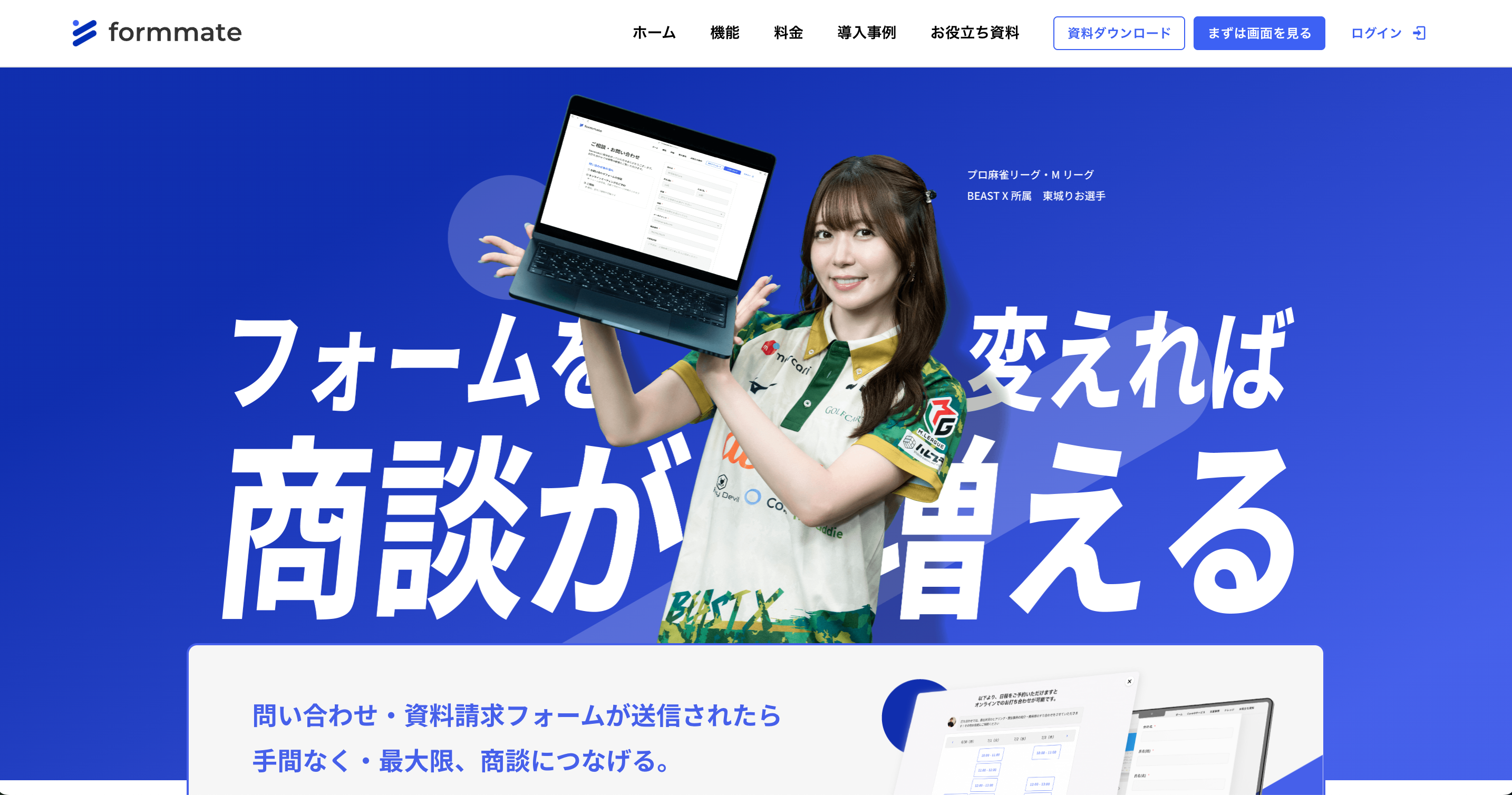 「項目は削れないが、離脱率は下げたい」「営業部門も納得する、質の高いリードを効率的に獲得したい」とお考えであれば、ぜひ一度formmateのサービスサイトをご覧ください。