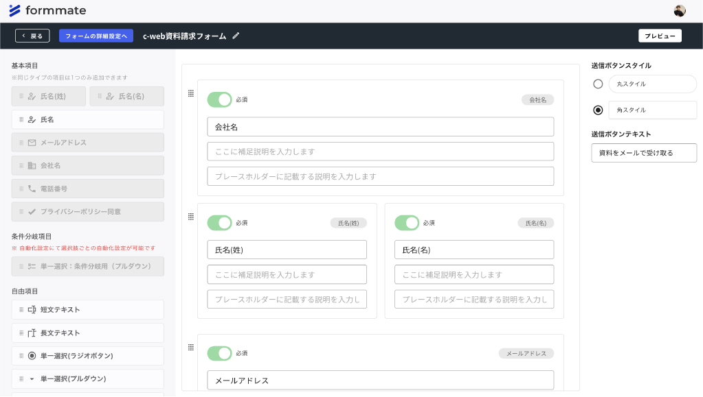 formmateは、最初のフォーム項目を「会社名・メールアドレス・氏名」といった最低限の必須項目に絞り込むことも可能です。