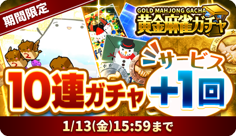 株式会社ウインライトの提供するオンライン麻雀アプリ「ジャンナビ麻雀オンライン」のアプリ内で常設されている黄金麻雀ガチャにて、通常2000ポイントで回せる10連ガチャが期間中、価格は据え置きでプラス1つアイテムが多く排出されて11連ガチャとなるキャンペーンを実施いたします。