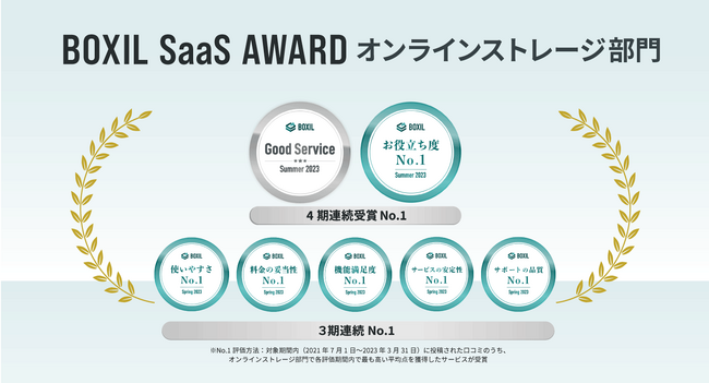 ファイルフォース株式会社(本社:東京千代田区大手町、代表取締役:サルキシャン アラム、以下「ファイルフォース」) は、スマートキャンプ株式会社(以下「スマートキャンプ」)が今最も評価されているSaaS(※)を表彰する「BOXIL SaaS AWARD Summer 2023」で「Fileforce」がオンラインストレージ部門で「Good Service」ならびに、「お役立ち度No.1」に選出されたことをお知らせします。尚、本内容での受賞は、昨年9月から4期連続となります。