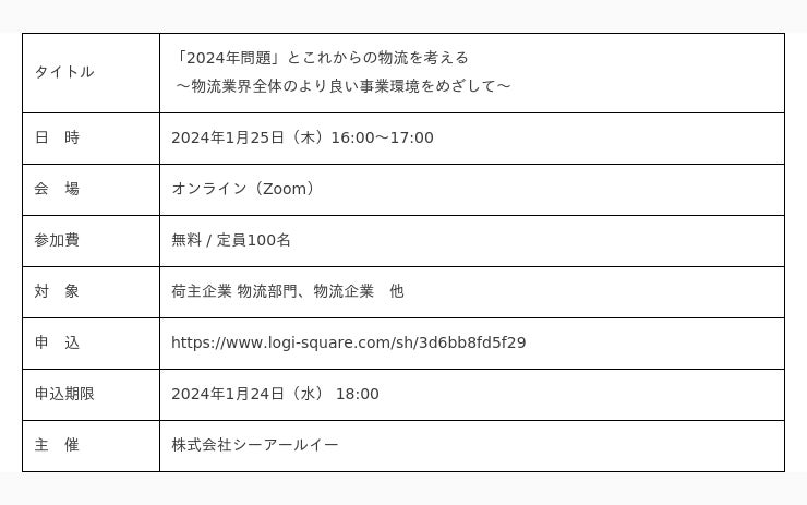 【荷主・物流企業向けセミナー】「2024年問題」とこれからの物流を考える〜物流業界全体のより良い事業環境をめざして〜|2024年1月25日(木)開催|CRE
