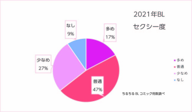 2021年に出版されたBLコミックのセクシー度の割合を見ていきますと「普通」が約5割でした。セクシーシーンが多めのBLは17%、セクシーシーンがないBLは1割弱という結果になっていますが、この比率は2020年とほとんど変化がありませんでした。