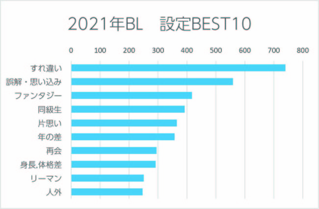2021年多かったシチュエーションですが、「すれ違い」設定が1位でした。2位の「誤解・思い込み」も含めて、恋半ばで起こる二人の気持ちの揺れ動きはBL最強のスパイス。いつの時代も人気の設定です。