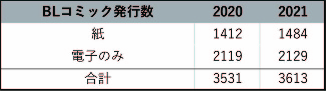 BLコミック発行数は2021年は紙で出版されたタイトル数は1484冊。電子のみの出版は2129冊。合計すると3613冊という結果になりました。(電子版の出版はのちに紙で出版されることもあるのでタイトルがかぶる場合があります)