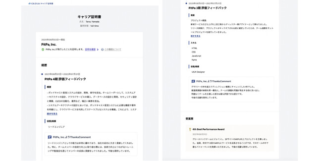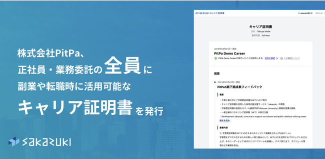 株式会社PitPa(本社:東京都渋谷区 代表取締役:石部達也、以下「PitPa」)は、人事施策の一貫として、2023年8月時点で契約を結んでいる正社員及び業務委託の全従業員に対し、社内での職歴と実績を記載した「キャリア証明書」を発行しました。