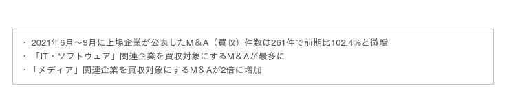 M&A総合研究所、「上場企業M&A動向レポート【2021年6月〜9月版】」を発表〜「メディア」関連企業を対象としたM&A(買収)が前期比2倍に増加〜