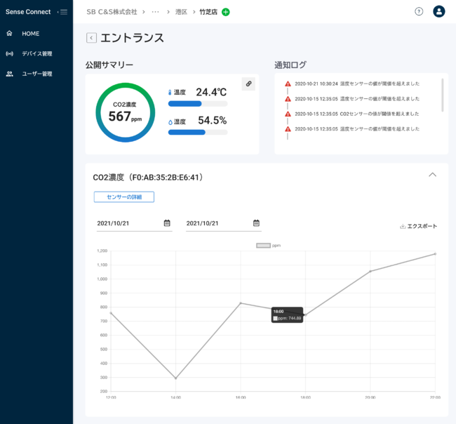 「Sense Connect for 環境可視化」は店舗やオフィス、学校など、施設内のCO2や温湿度、PM2.5といった空気環境を高精度センサーにて自動で測定・記録し、可視化します。新型コロナウイルスやインフルエンザといった感染症対策の一環としてCO2や温湿度の計測・可視化や、呼吸器系に影響を及ぼす可能性がある粒子状物質PM2.5やPM10の計測・可視化することで換気や空気の清浄化を促し、空気質の改善に貢献します。施設に低価格で簡単に取り付け可能な環境センサーを設置することで、施設内の温度を自動で計測し、離れた場所から、パソコンやスマートフォンで計測データをグラフや数値で確認できます。異常値の場合は管理画面やメールでアラート通知を行います。また、時系列データの作成や拠点やセンサーの数に応じた一括管理にも対応します。