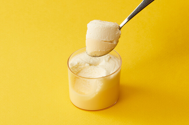 味の主役となる下の層は生クリームに砂糖を加えた卵黄とマスカルポーネチーズをあわせています。上の層はちょっぴりレモンの酸味を感じられるクリームチーズ。丁寧に作り上げることで口当たりの良いなめらかなクリームに仕上がりました。2層のチーズクリームをスプーンですくって一緒にお召し上がりください。
