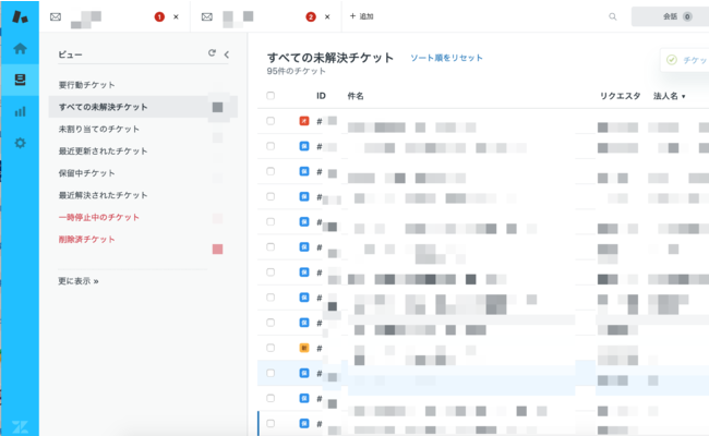 メールやチャット、SMS等の顧客管理ツールやウェブアプリをZendesk上で統括して時系列で可視化。プロジェクトごとに許可された複数のチームメンバーがログインし、共同でタスク管理できるようになるため、顧客からの連絡の見落としやタスクの抜けの発生を防ぎ、細やかなサポートとともにより一層スムーズで高度な実務性を備えたミーティングが可能となります。
