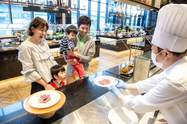 期間中はお子様向けメニューを各種ご用意。ランチタイムにはホテルの横を走る新交通ゆりかもめの車両を模した「ゆりかもめコラボロールケーキ」などが登場。お子様と一緒に、レストランでゆりかもめを眺めながら特別なお食事のひとときをお楽しみいただけます。ディナータイムにはライブキッチンでハンバーグと焼き野菜にとろり美味しいチーズをかけてご提供。さらに那須野が原牛を使ったステーキカッティングもお楽しみいただけるほか、スペシャルスイーツにこどもの日にちなんだ「こいのぼりケーキ」をご用意してお子様の健やかな成長を記念いたします。