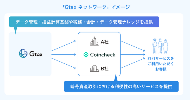 この度の「Coincheck」への損益計算機能の提供を皮切りに、今後「Coincheck」以外の取引サービスにも類似の損益計算機能の提供を検討しております。当社が提供するデータ管理・損益計算基盤を採用する企業群「Gtaxネットワーク」において、取引データの画一的な管理を礎とする確定申告自動化の実現、延いては健全な納税環境の整備を前提とした前向きな税制改革が実現できるよう尽力してまいります。