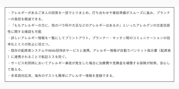 アレルギーヒアリングシステムは、団体会食の出席予定ゲストの食事制限に関する情報を事前に直接入力していただくことで、食物アレルギーやベジタリアン、妊娠・授乳中などの詳細な情報を正確かつスムーズに把握できるサービスです。