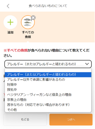 また、以前は食事制限の理由を選択してから食材を選択していましたが、食材を選択してから食事制限の理由を選択する仕様に変更しました。たとえば「乳糖不耐症」の人は食材「乳」、グルテン不耐症の人は食材「小麦」の項目において、理由をたずねられた際に「アレルギー以外で体調に影響があるもの」を選択することになります。