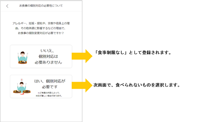 食事制限があるゲストの中には、「食事が提供されてから自分で食べられるかどうかを判断するので、食材の除去や代替といった特別な対応はしなくてもよい」という人もいます。こうした人を把握するため、個別対応の要・不要を確認する質問を追加しました。