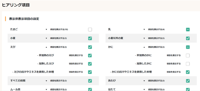 事業者・ゲストの皆様のご要望やCAN EATに蓄積された食物アレルギーのデータをもとに、以下のヒアリング項目を追加しました。ヒアリングが不要な食材は非表示にすることもできます。