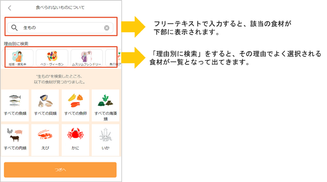 「生もの」なら「肉類」なのか「魚類」なのか、「魚介類」なら「魚類」「貝類」「海藻類」「魚卵」のうちどれなのかといった詳しいヒアリングを簡単に実施できます。
