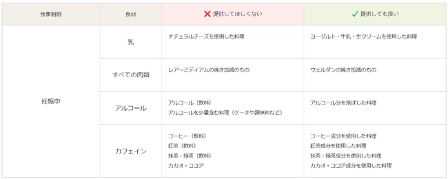 食事制限情報のとりまとめ結果一欄に「食材」の項目を追加し、食材ごとに「提供してほしくないもの」「提供してもよいもの」が表示されるようにしました。同時にこれまで記載されていた食材名などを統廃合し、表の視認性を高めています。