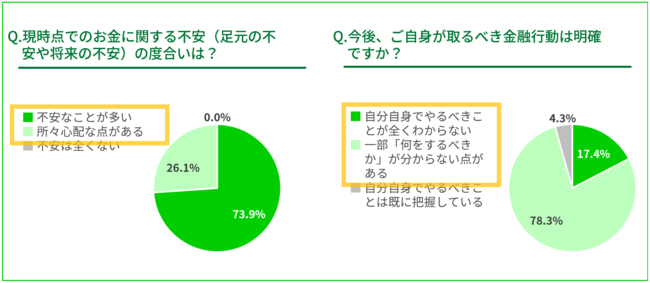 現時点でのお金に関する不安の度合いを聞いたところ、全員が「不安あり」と回答。また、ご自身が取るべき金融行動は明確かどうかを質問したところ、95.7%の方が「なにをやるべきか分からない」と回答しました。現在・将来にわたって、何らかの経済的な不安を抱えつつも、その対策が明確でない方が多いことが伺えます。