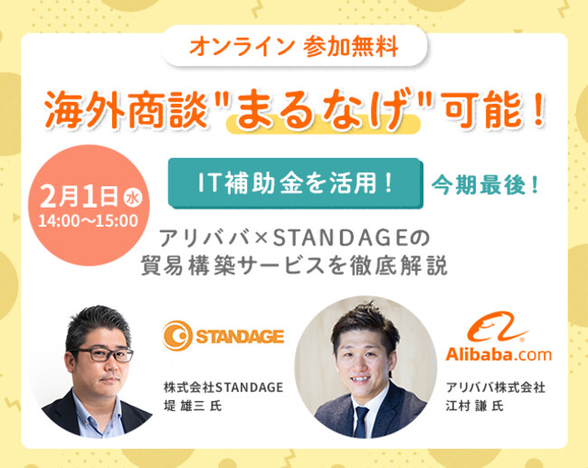 2月1日、アリババ株式会社(本社:東京都中央区、代表取締役社長CEO:岡田聡良、以下、アリババ)は株式会社STANDAGE(本社:東京都港区、代表取締役CEO:足立彰紀、以下STANDAGE)と共同で「IT補助金を活用!アリババ×STANDAGEの貿易構築サービスを徹底解説」をオンラインで開催いたします。