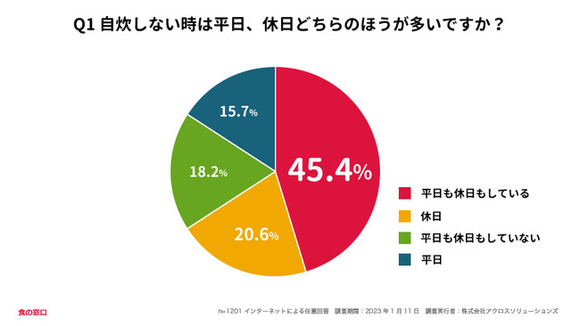 次いで休日に自炊をしないという人が多く20.6%で、平日と休日のうち自炊しないことが多いのは「休日」でした。