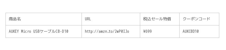 AUKEYは、10年以上のハードウェア開発の経験を有し、先端技術を採用し信頼性の高い家電製品とスマートフォン周辺機器を開発・生産しております。 Micro USBケーブルCB-D10をAmazon.co.jpにて発売させていただきます。今回、発売を記念して2017年8月31日(木)から2017年9月5日(火)まで30%OFFのキャンペーンを実施いたし、クーポン「AUKCBD10」で699円(300円オフ)でご購入いただけます。