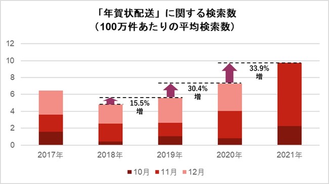 【注】上記グラフは、2017年〜2021年の10月・11月・12月の3ヶ月間(2021年は10月・11月の2ヶ月間)の「年賀状配送」に関する仕事検索数の推移を表しています。検索数は、100万件あたり数値を示しており、実数字ではありません。