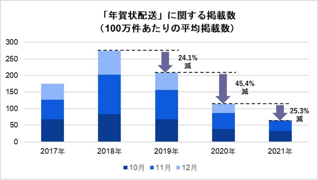 しかしその後は2019年、2020年と、年賀はがきの発行部数と同様に仕事掲載数も減少しています。2019年は前年比24.1%減、2020年は前年比45.4%減、2021年は前年比25.3%減(*3)と減少傾向にあることがわかりました。