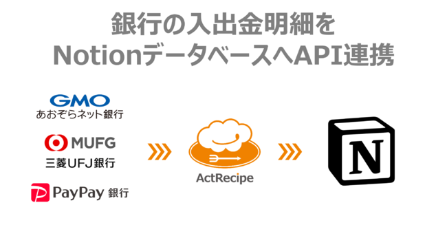 ActRecipeでは、2022年1月よりNotionとのAPI連携を開始し、これまでに情報資産のストック化として「Jira Software - Notion連携」「Zendesk – Notion連携」の各レシピをご提供してまいりました。Notionをはじめとするノーコードサービスの活用によって企業の業務の在り方が大きく変化する中で、ActRecipeとしてもこれまでにない利便性の高いユースケースを模索しており、今般の銀行の入出金明細をNotionのデータベースへ連携するレシピ(以下、本連携)のリリースに至りました。