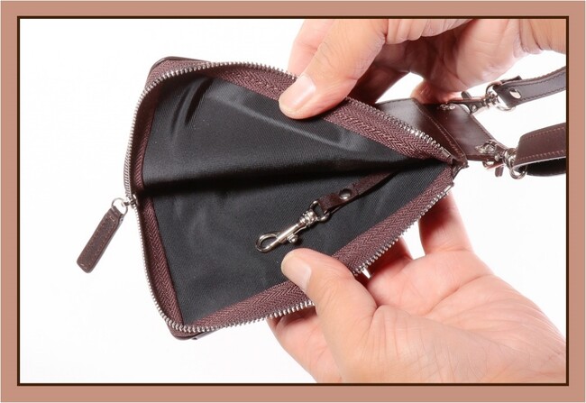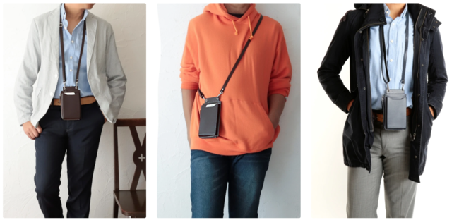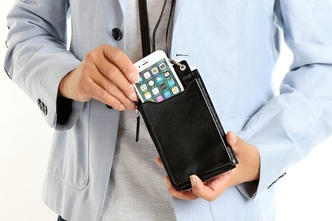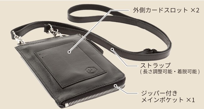 一般的なネックウォレットに比べ、マチが広めにデザインされているため、カードケースやキーケースなどもそのまま収納可能です。外側ポケットにはスマートフォン収納スペースや便利なカードスロットが付いています。