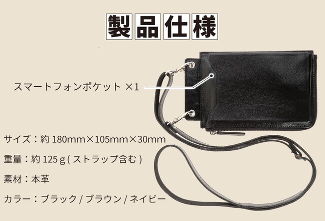 カラーは合わせやすいブラック、ネイビー、ブラウンの3色を展開しています。高品質かつシンプルで上品なデザインで、大人の方でもシーンを選ばず使えるネックウォレットです。