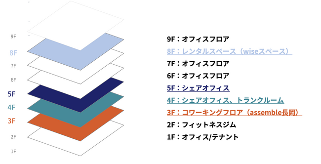 2階はフィットネスジムになっており、コワーキングエリアの月額会員はフィットネスジムを¥2,178/月でご利用いただけます(通常¥3,278/月)。4階はシェアオフィス3部屋とトランクルームになります。トランクルームは個人・法人問わずご利用いただけます。オープンは11月下旬を予定しております。5階はシェアオフィス5部屋になります。オフィス利用の他にも、ネイルやエステサロンなど個人で事業を始めるきっかけとしてのテナントとしてもご利用いただけます。8階はレンタルスペース(Wise space)になっております。