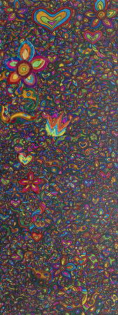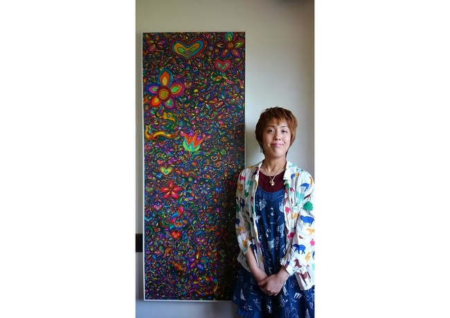 大仙市在住。自閉症であることで幼い頃はさまざまな苦境に直面することもありましたが、現在は自宅で営業しているヘアーサロンの店頭に立ち、お客様のシャンプーなどを担当する傍ら休日は精力的に絵を描き続けています。彼女が描く作品は、表情豊かでまるで楽しそうに会話をしているような動物達や、?鮮やかで溢れるほどの生命力を感じさせる草花が画面を一杯に埋め尽し、彼女の心が住む世界の風景です。同時に、現実世界に対する「あなたが笑顔でありますように」という彼女の願いが込められています。
