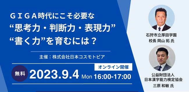 「自立学習」「生涯学習」を事業の軸とし、学習塾・学校・生涯学習教室向けICT教材システムの企画・制作・販売を手がける株式会社日本コスモトピア(本社:大阪府大阪市、代表取締役社長:下向 峰子、以下:日本コスモトピア)は、学校関係者、教育委員会ご担当者を対象とした無料オンラインセミナー「GIGA時代にこそ必要な“思考力・判断力・表現力”“書く力”を育むには?」を、9月4日(月)16:00-17:00に実施します。
