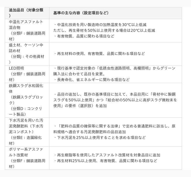 また、「国等による環境物品等の調達の推進等に関する法律(グリーン購入法)」の公共工事【資材】で対象としている特定調達品目のうち、これまでエコマークの対象ではなかった5品目も対象品目に追加しました。基準項目はグリーン購入法の「判断の基準」も同時に満たす内容としており、公共工事の入札等での活用が期待されます。