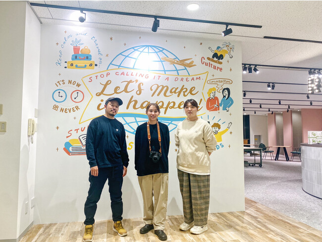 オフィスに入り目の前に見えるカラフルなイラストは、”手描きグラフィックアーティスト”として第一線を進み続けるCHALKBOY(チョークボーイ)さんによる手描きアート。色鮮やかなイラストとインパクトのあるメッセージで、これから留学に挑戦する方々を応援しています。