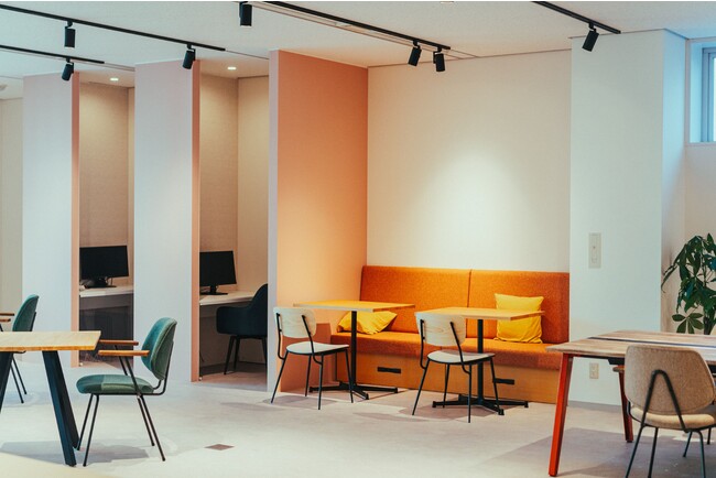 オフィスの奥にはカフェのようなワークスペースと個室スペースがあり、作業に集中したいときに利用できる空間となっています。