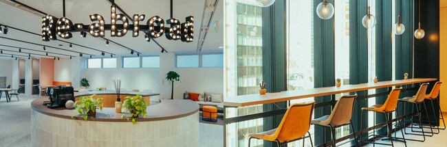 また、窓際には新宿のオフィス街を一望できるカウンターがあり、スタンディングスペースとしても利用可能です。温かみのあるオレンジ色のチェアとライトで落ち着いて働くことができます。