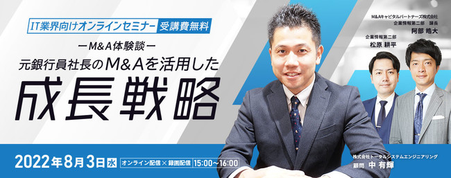 M&Aキャピタルパートナーズ株式会社(東京都千代田区・代表取締役社長 中村悟)は、IT業界向けM&A無料オンラインセミナーを2022年8月3日(水)15:00〜16:00に開催いたします。